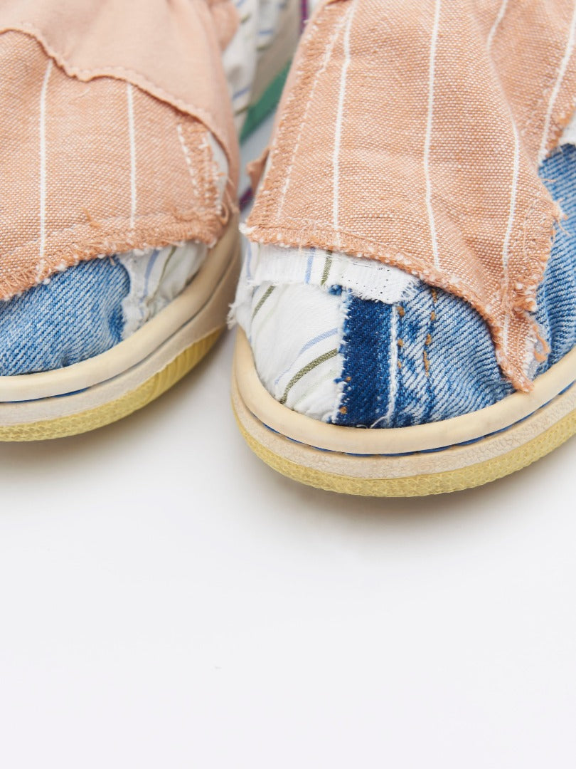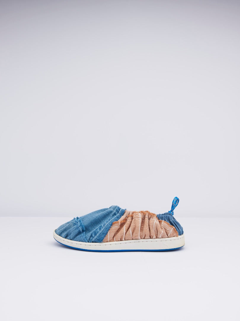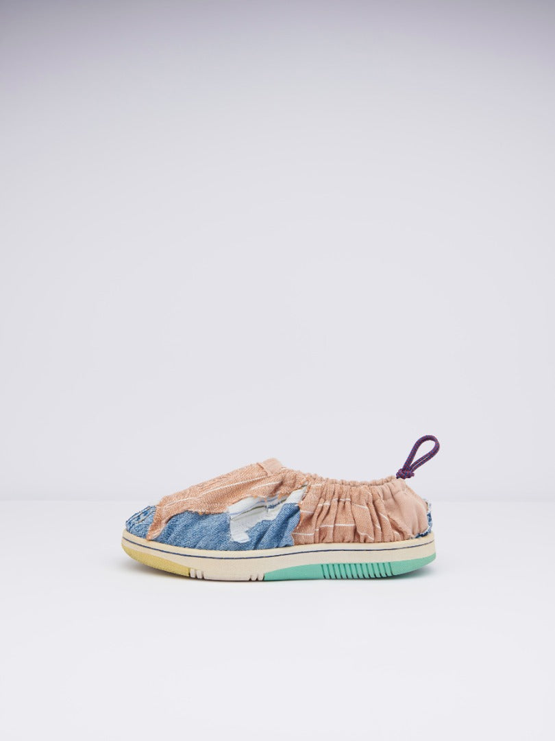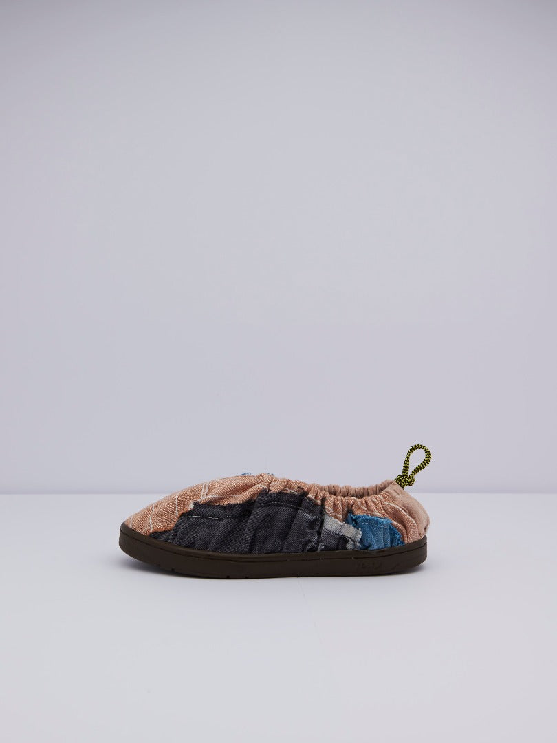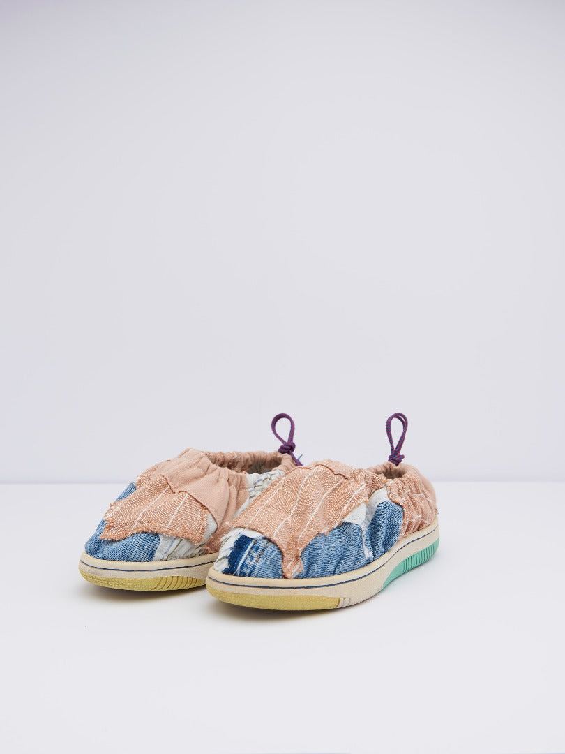 Handmade footwear from unique patchwork fabrics crafted from various upcycled textiles obtained from used clothing. Soles are made from our own recycled or biodegradable materials.