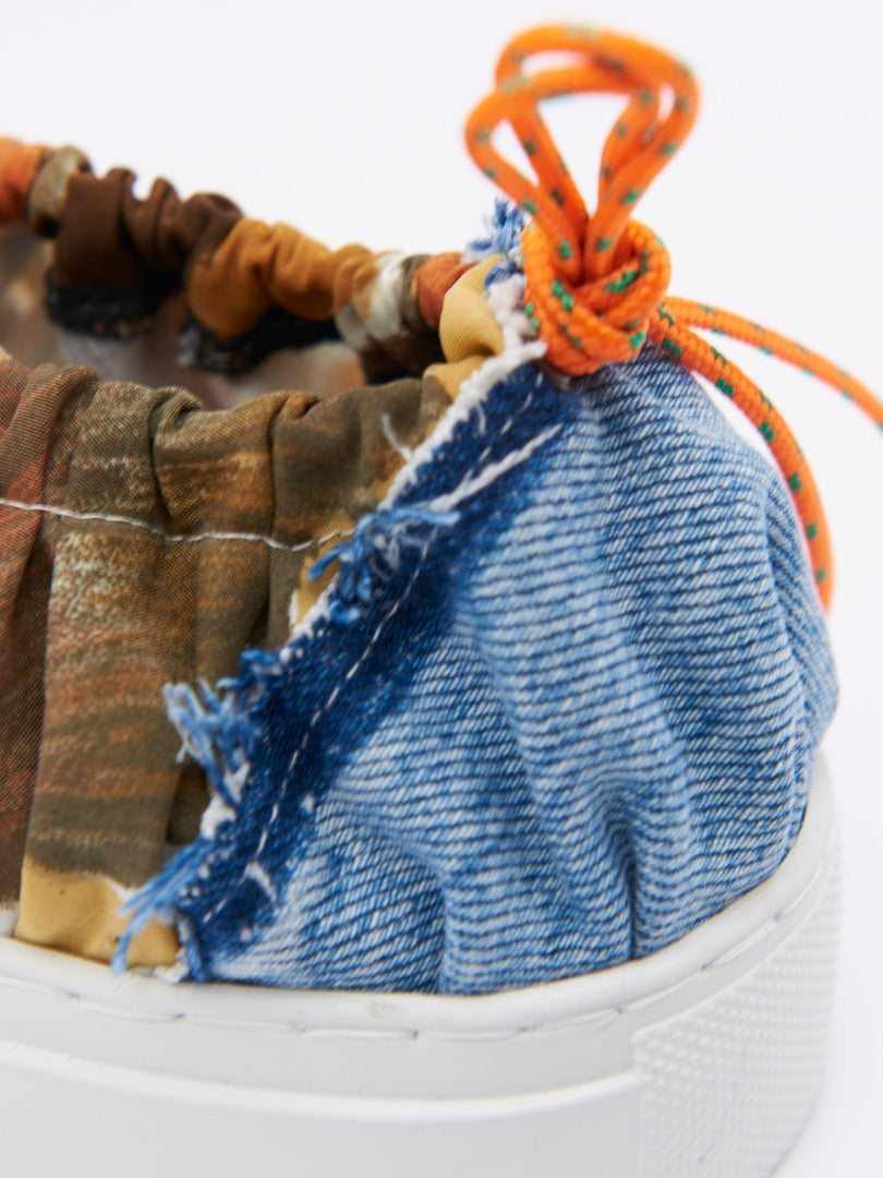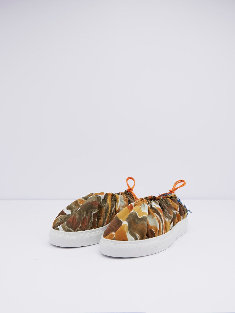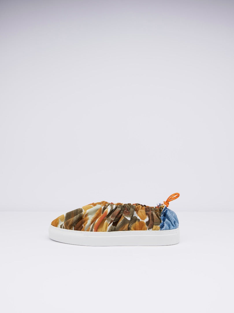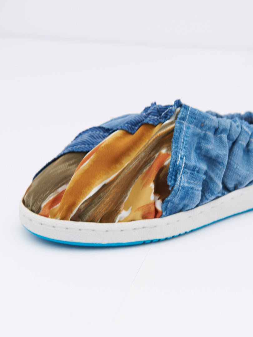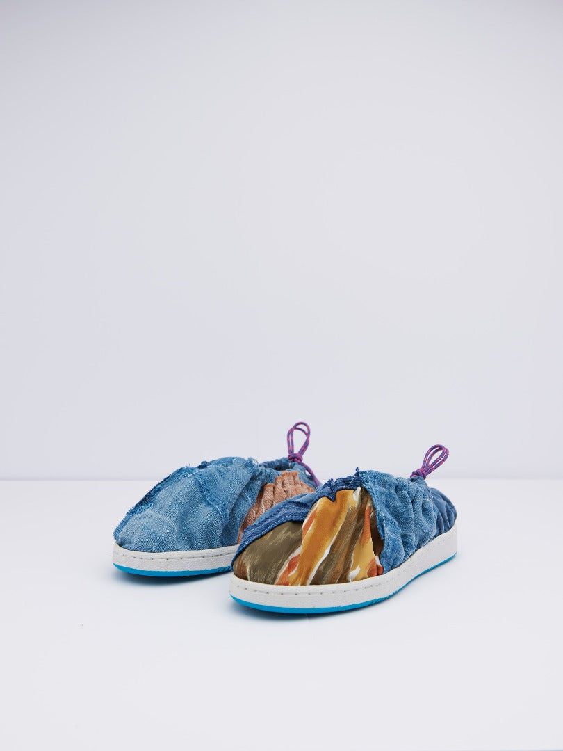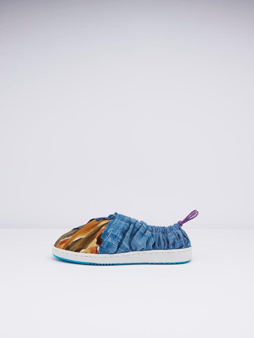 Handmade footwear from unique patchwork fabrics crafted from various upcycled textiles obtained from used clothing. Soles are made from our own recycled or biodegradable materials.
