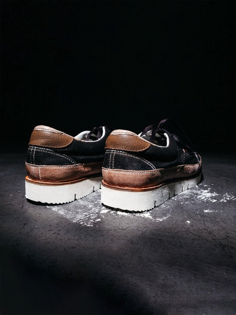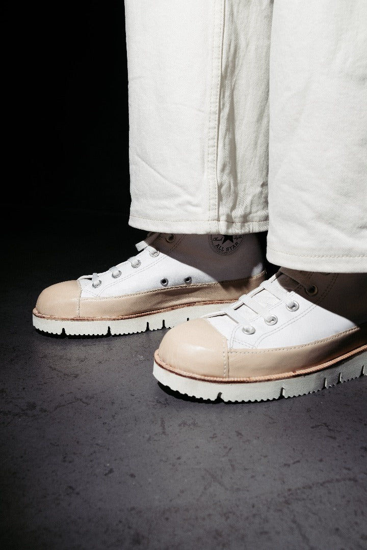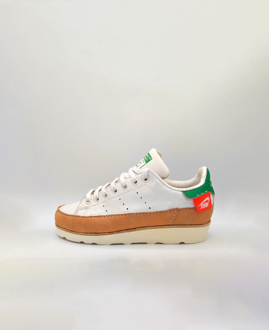 Upcycled streetwear shoes, repaired and reinforced to last. We begin with carefully selected worn-out shoes, restoring their uppers with precision and replacing the old soles with our own, made from recycled or biodegradable materials. The design is reinforced with high-quality leather, enhancing durability and breathing stylish new life into once-discarded treasures.